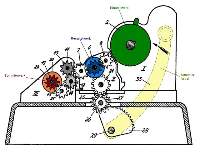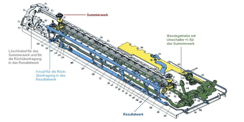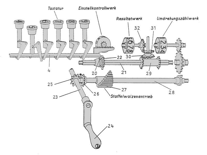 [7] | Wilhelm Lind, "Büromaschinen", C. F. Winter'sche Verlagshandlung, Füssen 1954, Abschnitt C.3.b): "Maschinen mit geteiltem Sprossenrad". |