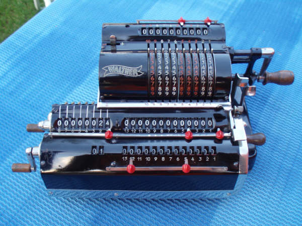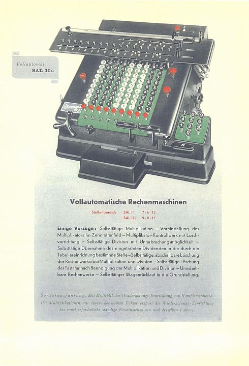 Facit EA (1939-1943). Im Jahr 1939 erschien das Modell EA - eine halbautomatische Rechenmaschine mit automatischer Division und selbsttätiger Schrittschaltung nach links oder nach rechts bei der Multiplikation. Im Vergleich zur Facit EK wurden auch einige neue Bedienelemente hinzugefügt. Neben der Taste ADD für die einfache Addition mit anschließender Löschung des Einstellwerks gibt es eine Multiplikations- oder Plusdauertaste × für die Mehrfachaddition sowie eine kombinierte Divisions- und Minusdauertaste ÷. Ferner wurde ein Hauptsteuerhebel angebracht, der in drei Lagen eingestellt werden kann: In der Links- und Mittelstellung (Multiplikationslage) haben Resultat- und Quotientenwerk den gleichen Drehsinn, der Divisionsimpulshebel ist unwirksam, und die Sprossenradtrommel ist auf Links- bzw. Rechtsgang geschaltet. In der Rechtsstellung (Divisionslage) sind Resultat- und Quotientenwerk gegenläufig, der Divisionsimpulshebel ist wirksam, und der Sprossenradrotor auf Rechtsgang eingestellt. Zusätzlich besitzt die Maschine einen Abstellhebel, der in seiner Linkslage bei Mittelstellung des Hauptsteuerhebels die selbsttätige Schlittenschaltung nach rechts abstellt, so daß Rechenoperationen ohne Selbstgang der Sprossenradtrommel ausgeführt werden können. Bei der halbautomatischen Multiplikation wird für jede Stelle im Multiplikator die Plusdauertaste × solange gedrückt, bis die entsprechende Ziffer im Umdrehungszählwerk erscheint. Beim Loslassen der Dauertaste wird dann der Sprossenradschlitten je nach Lage der Steuerhebel automatisch um eine Stelle nach links oder nach rechts verschoben, so daß die Multiplikation gleich in der nachfolgenden Dezimalstelle fortgesetzt werden kann. Mit dem Hauptsteuerhebel und dem Abstellhebel kann man dabei festlegen, in welcher Reihenfolge der Multiplikand abgearbeitet werden soll: von der niedrigsten zur höchsten Stelle (bei Linksstellung des Hauptsteuerhebels) oder umgekehrt (bei Mittelstellung des Hauptsteuerhebels und Rechtslage des Abstellhebels).