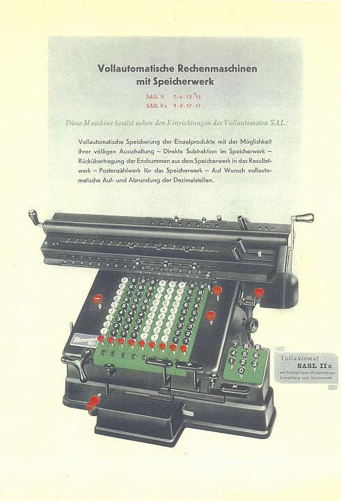 Bis 1938 unsichtbares, danach sichtbares Summierwerk im Schlitten; Abspeichern mit Taste S, Rückübertragung mit Taste SL | DE691446 DE697151 DE720359 DE733184 |