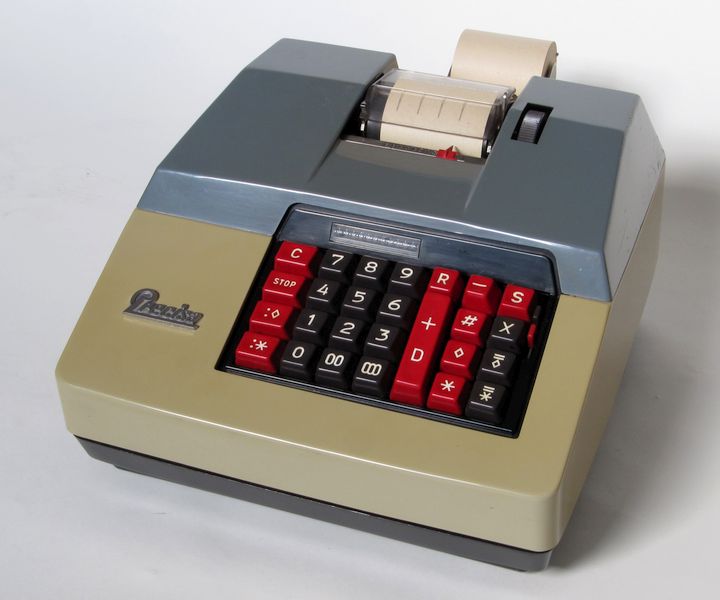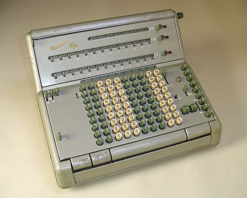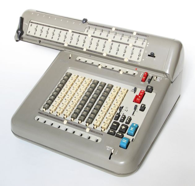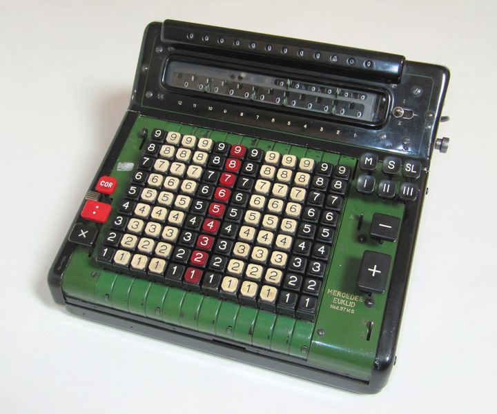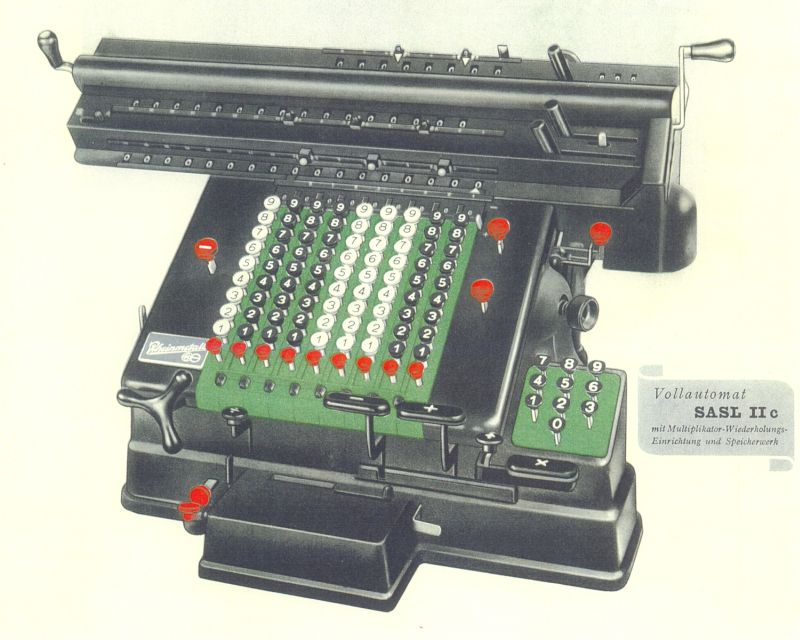 Facit ESA (1945-1949). Im Jahr 1945 kam die erste Rechenmaschine der Firma Facit auf den Markt, die neben der Division auch die Multiplikation automatisch durchführen konnte - das Modell ESA (= Elektriska Super Automaten). Diese Vierspeziesmaschine war zugleich die erste vollautomatische Sprossenradmaschine bzw. der erste Zehntasten-Vollautomat weltweit. Im Gegensatz zu den Tischrechenautomaten anderer Hersteller aus dieser Zeit, bei denen die Faktoren entweder nebeneinander in eine Volltastatur eingetippt werden (z.B. Mercedes Euklid 38MS) oder die ein eigenes Zehnertastenfeld für den Multiplikanden besitzen (z.B. Rheinmetall SASL), ist das Multiplizieren auf der Facit-Maschine vergleichsweise bequem und mit dem Multipliziervorgang auf heutigen Tischrechnern vergleichbar: Nachdem der Multiplikator eingetastet ist, drückt man die Produkttaste ×. Anschließend wird der Multiplikand in gewohnter Weise (von links nach rechts) in die Zehnertastatur eingetippt und der Multipliziervorgang mit der Taste = gestartet. Für die Multiplikation wird insbesondere also nur eine einzige Tastatur benötigt.