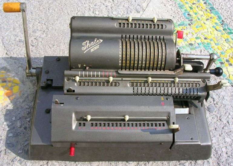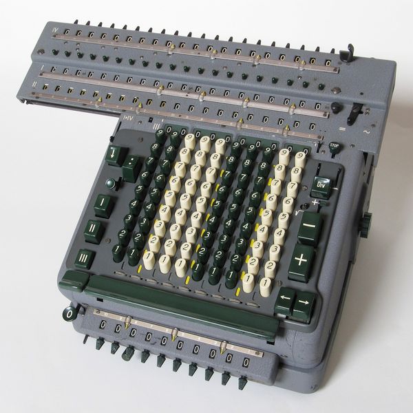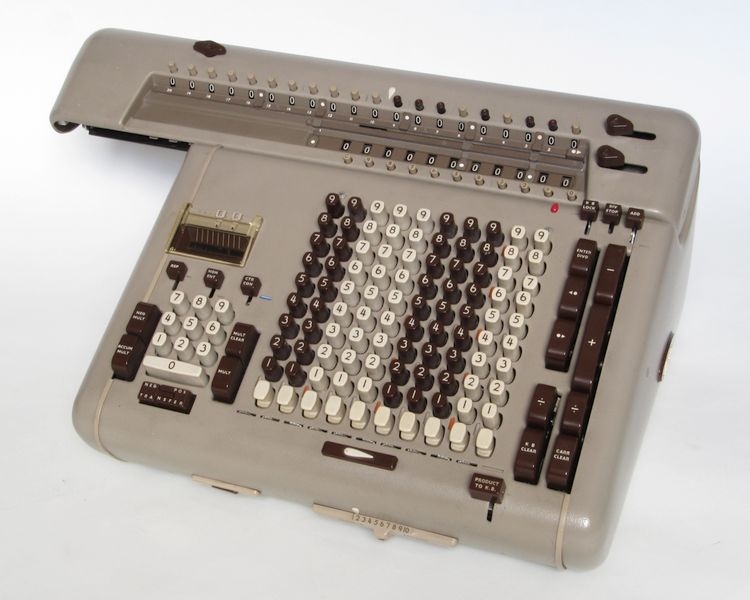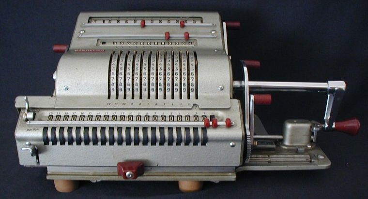 Facit E (1934-1939). Das Ausführen einer Rechenoperationen erfolgt bei der Facit T noch manuell durch Drehen einer Kurbel. Bereits 1934 erschien auch schon die elektrifizierte Version des Modells T, die Facit E, bei der die Sprossenradtrommel mit Hilfe eines Elektromotors gedreht wird, und zwar mit einer Geschwindigkeit von ca. 400 Umdrehungen in der Minute. Diese Maschine besitzt neben den zehn Einstelltasten für die Sprossenräder sowie den drei Tabulatortasten für die Schlittenschaltung noch eine Funktionstaste + für die Addition (Multiplikation) und eine Funktionstaste - für die Subtraktion (Division). Außerdem befindet sich an der Vorderseite ein verschiebbarer Hebel, der in zwei Lagen eingestellt werden kann, wobei die untere Lage mit Addition/Subtraktion und die obere Lage mit Multiplikation/Division bezeichnet ist. Wenn dieser Hebel in der unteren Lage eingestellt ist, werden die Sprossenräder nach jedem Maschinengang nullgestellt; im anderen Fall erfolgt die Nullstellung erst nach Eindrücken der Nullstelltaste 0, so daß z.B. Multiplikation, also die fortgesetzte Addition, möglich wird. Die Nullstelltaste, mit der das Einstellwerk gelöscht wird, war ebenfalls neu und ersetzte den Löschhebel auf der rechten Seite, während die Löschvorrichtung für das Resultat- und Quotientenwerk beibehalten wurde.